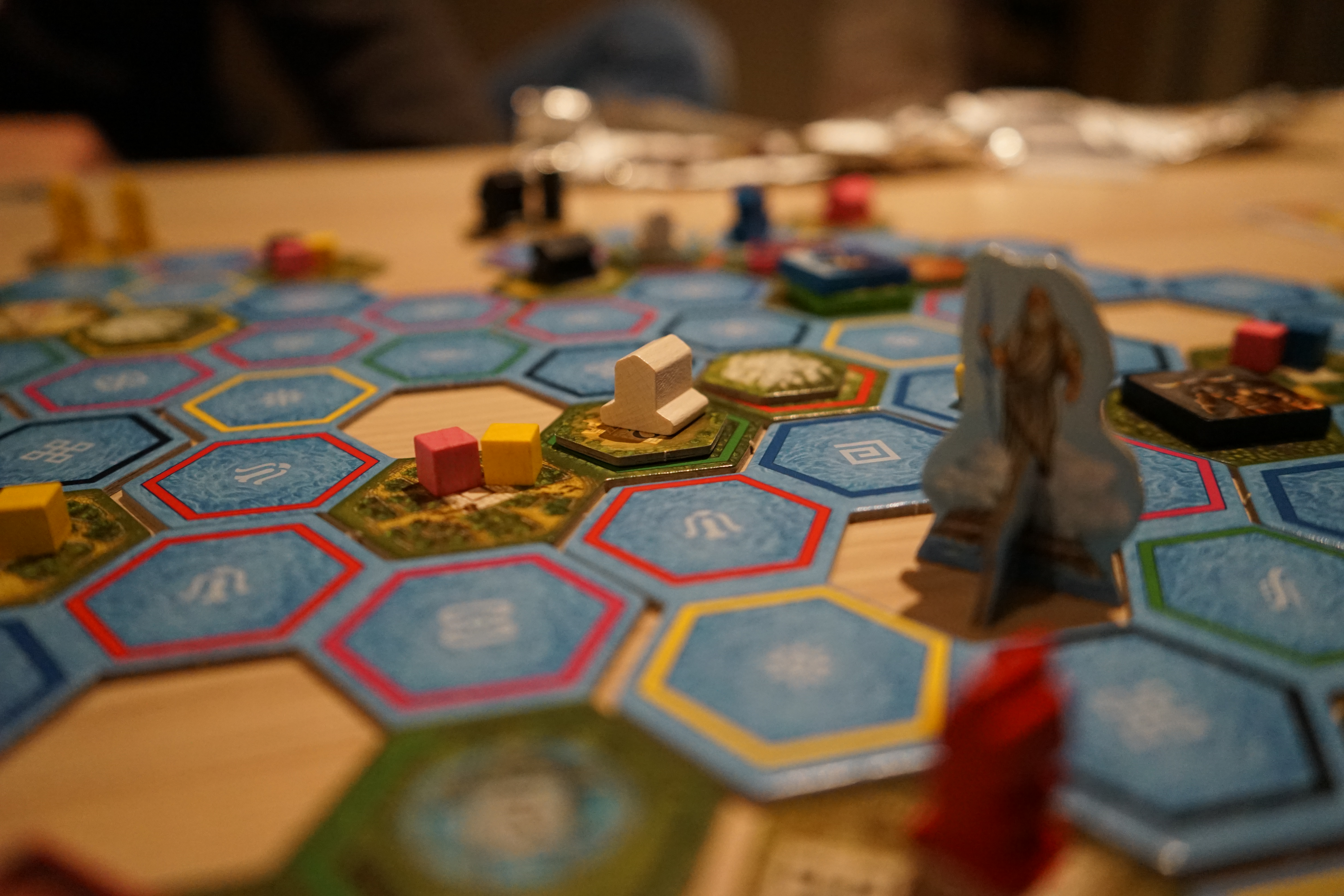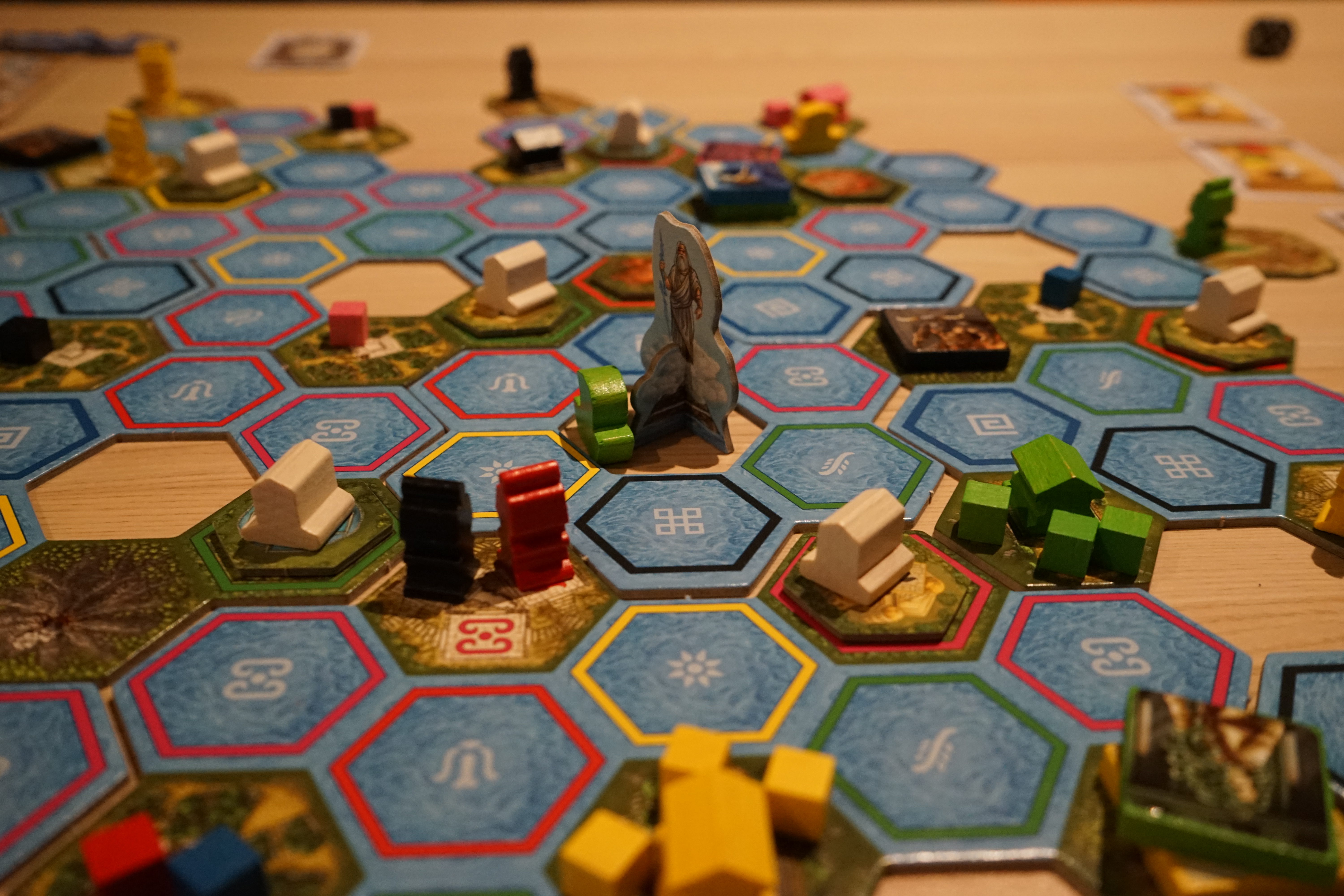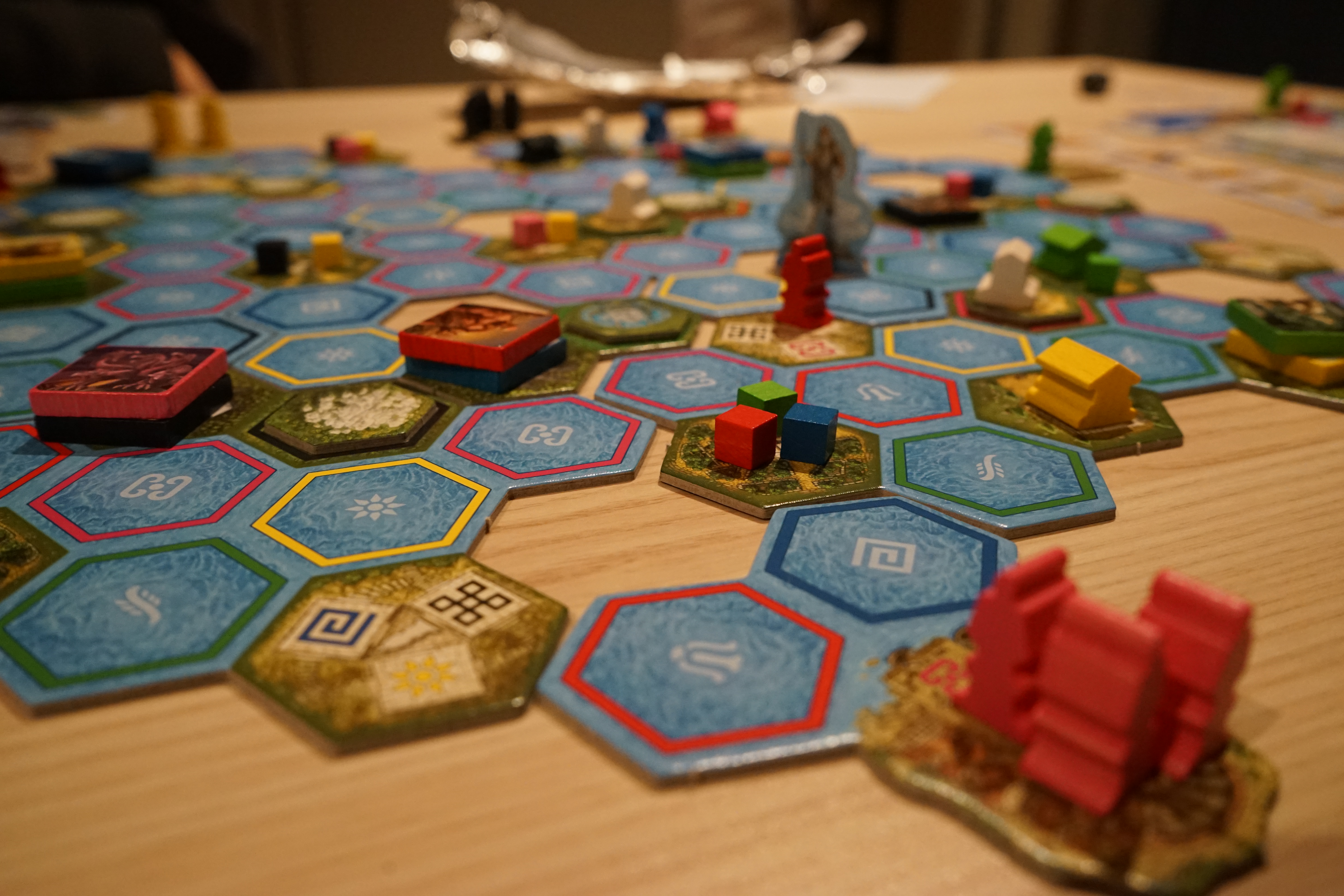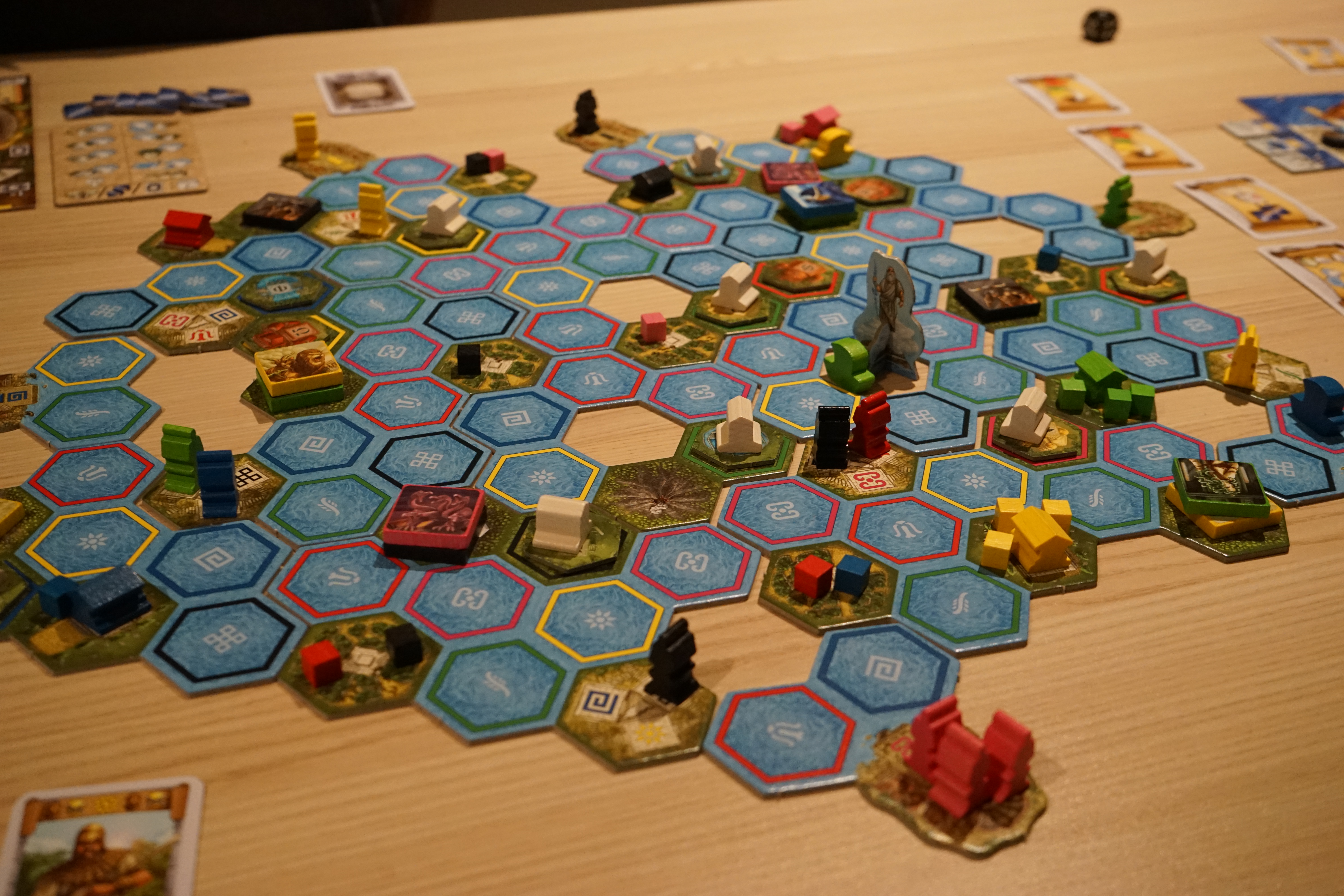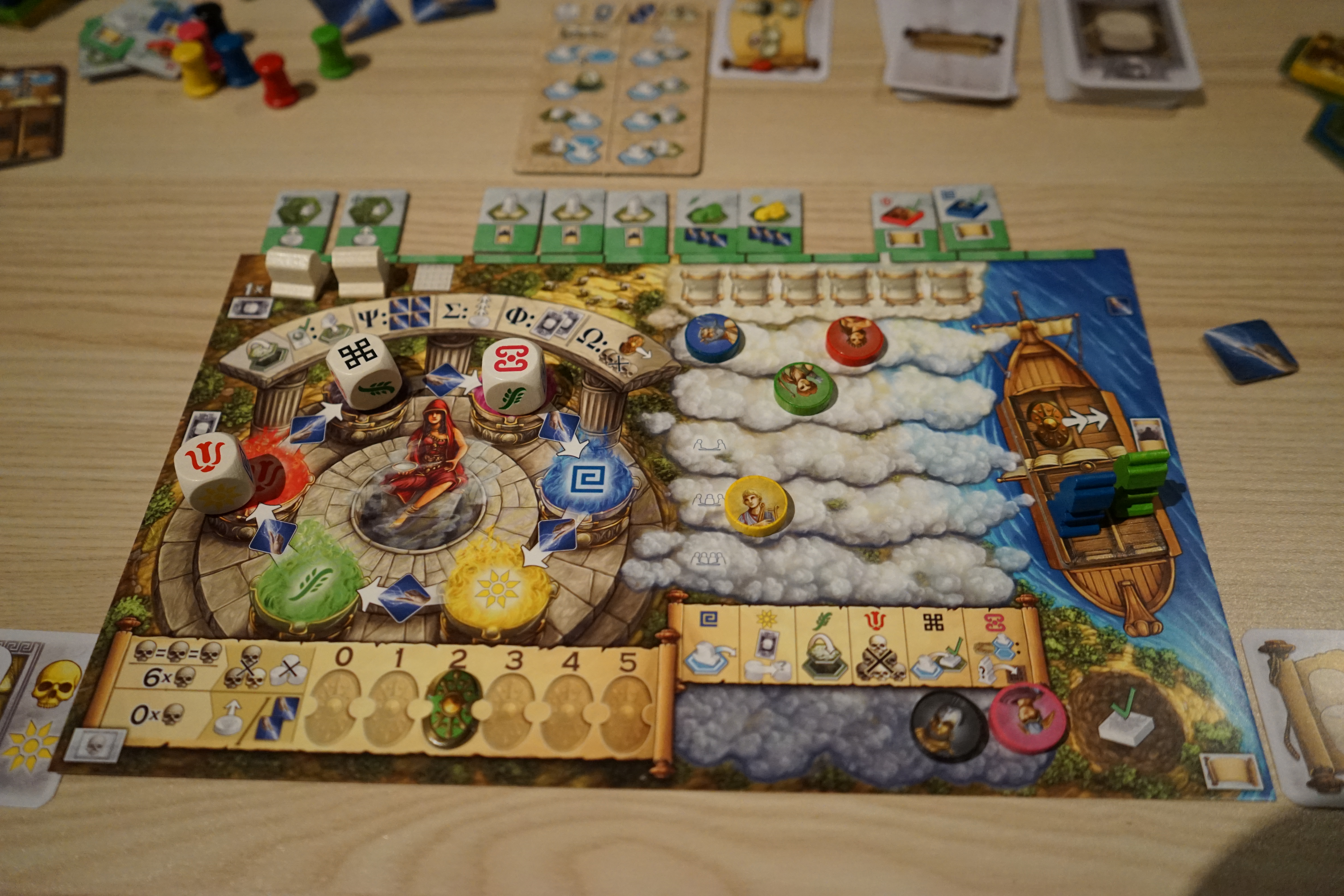 Qui dit « dé », dit aléatoire ?  Pas vraiment ! En effet, vous pouvez aussi changer les couleurs de votre dé en dépensant des jetons « faveurs » et, donc, maîtriser un peu les aléas à condition d’en avoir en réserve. Enfin, vous allez conclure votre tour en faisant monter de petits jetons représentants les dieux de la mythologie, plus précisément ceux des autres joueurs. Après avoir atteints les cieux, ceux-ci vous donneront un super bonus, puis seront remis au départ pour monter de nouveau. Cette fois, ce sera plus aléatoire, sauf si vous avez prévu de les monter un peu chacun.