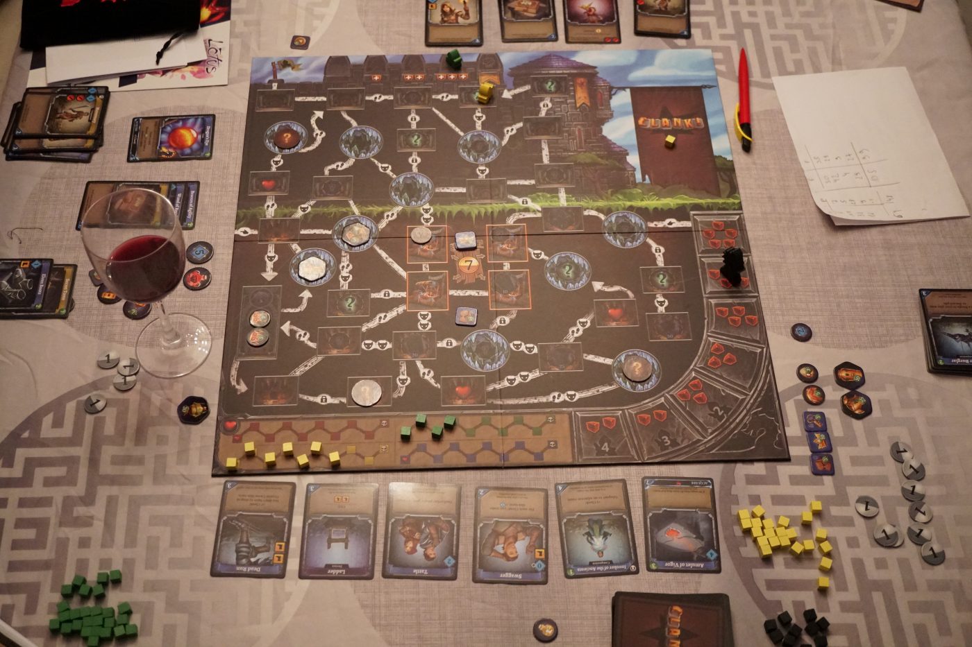 Grâce à une construction de deck intelligente, les voleurs vont pouvoir exécuter des actions de plus en plus puissantes.  Le choix des meilleurs cartes de la ligne des cartes à l’achat est crucial bien entendu sans être difficile vu qu’il est souvent plus intéressant d’acheter la carte la plus chère en fonction de ce qu’on peut donner.  Il n’y a pas 36 stratégies gagnantes car le jeu est plus une course qu’autre chose.  Et c’est bien ça qui est palpitant dans Clank.  Les voleurs vont galoper dans l’antre du dragon pour pouvoir voler en premier les trésors les plus convoités.  Dès que l’appétit doré d’un voleur est comblé, la course va alors dans l’autre sens à vouloir sortir de cet enfer avant que le dragon ne se fâche vraiment.  Le thème est très présent dans Clank et son plateau représentant le donjon ainsi que son sous-sol n’y est pas pour rien.