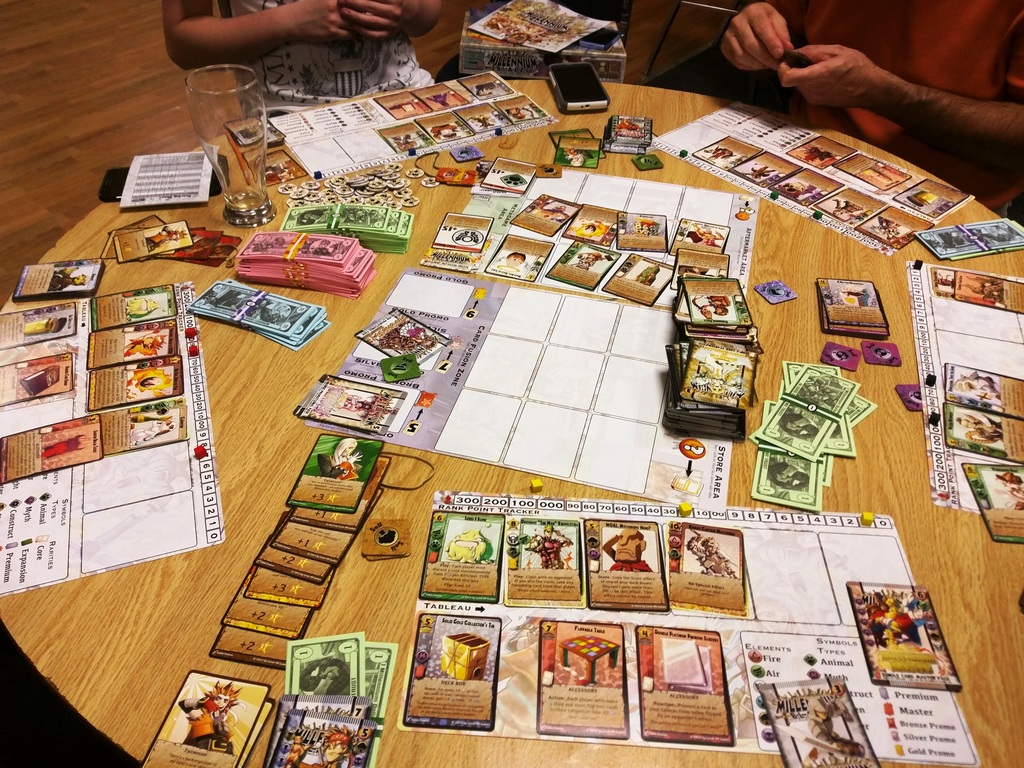 Nous sommes des joueurs de Magic et d’autres jeux de cartes à collectionner et nous allons dans les magasins pour acheter des boosters mais aussi pour acheter et vendre des cartes à la pièce. Nous allons également à des rassemblements pour échanger nos cartes et peaufiner notre deck. L’objectif étant d’obtenir un deck équilibré, cohérent et dont les cartes combottent bien. Tout cela, vous allez le faire dans Millennium Blades sauf y jouer !!! Oui, vous allez acheter des boosters, vendre, échanger des cartes, construire votre deck,… mais vous n’allez pas jouer aux cartes !!! Incroyable ce thème non ? Il est bien entendu à réserver à un public averti et ne parlera pas à tout le monde. Voilà qui est pour le moins osé et ce n’est pas pour rien qu’il a été nominé en 2016 pour les BGG Golden geek des jeux les plus innovants. C’est d’ailleurs l’excellent Captain Sonar qui a remporté ce prix l’année passée.