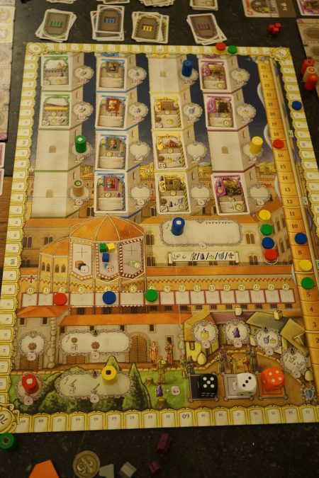– Il y a un système très astucieux pour placer les pions (un membre de chaque famille par tour maximum, sachant que le neutre peut être placé à côté d’un membre d’une famille + quand on place un pion dans une tour où il y a déjà un autre pion, à soi ou à un autre joueur, on doit payer pour pouvoir s’y placer) qui rend cette pose bien plus excitante qu’un jeu classique de pose d’ouvriers (sachant évidemment que pour la plupart des actions un seul pion peut être placé sur chaque case).