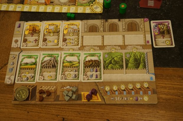 Le mécanisme de base est donc la pose d’ouvriers (4 par joueur, dont un «neutre»), qu’on va placer dans une case d’action disponible dans une des 4 tours (on achètera alors une carte) ou sur un des autres cases d’action disponibles. Vraiment classique de chez classique. Mais pas mal de petites ou grandes astuces vont très solidement pimenter ce menu de base: