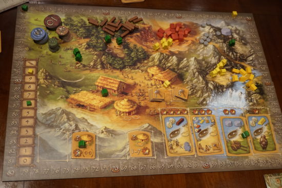 L’Age de Pierre se joue en une série de tours jusque lorsque la fin se déclenche par l’épuisement de certaines piles de cartes. Chaque tour est subdivisé en 3 phases : une phase de placement des ouvriers, une phase de réalisation des actions et une phase où il faudra nourrir vos ouvriers (Et oui, Agricola est sorti avant 🙂 ). Le jeu est assez classique puisque vous allez récolter des ressources pour les dépenser en nourrissant vos ouvriers et surtout en construisant des huttes qui vous rapporteront des PVs ou en achetant des cartes bonus. Vous allez également pouvoir engager de nouveaux ouvriers ou augmenter votre production automatique de ressources. Habitués des jeux de placement d’ouvriers, vous vous doutez bien que ces 2 dernières actions sont des must et que tout le monde se jette dessus à chaque tour. Dommage pour ça que ces choix soient trop évidents et qu’un équilibrage n’ait pas permis de rendre les autres actions aussi attractives que ces 2 dernières.