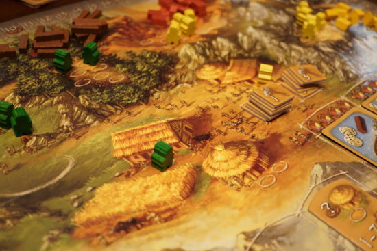 Le second élément hyper original du jeu et qui en fait sa particularité car, jusqu’à présent, peu voire aucun jeu ne l’a reprise : les ressources se gagnent aux dés !!! Et là, ça fait mal ! Nous qui choyons le côté cartésien des jeux modernes, dans l’Age de Pierre, nous allons lancer les dés qui vont indiquer combien de ressources on va pouvoir prendre. Le nombre d’ouvriers qu’on va consacrer à chaque action de récolte de ressources va déterminer le nombre de dés à lancer. Pire, il va falloir faire des calculs mentaux en divisant le résultat des dés par 2, 3, 4, 5 ou 6 en fonction de la ressource demandée. Et même si c’est le côté le plus rébarbatif de l’Age de Pierre, je le trouve hyper bien foutu. Evidemment, on va râler sur le résultat de certains lancés. Mais on va lancer tellement de fois les dés qu’on va également cacher notre joie lorsque les dés seront avec nous 😉