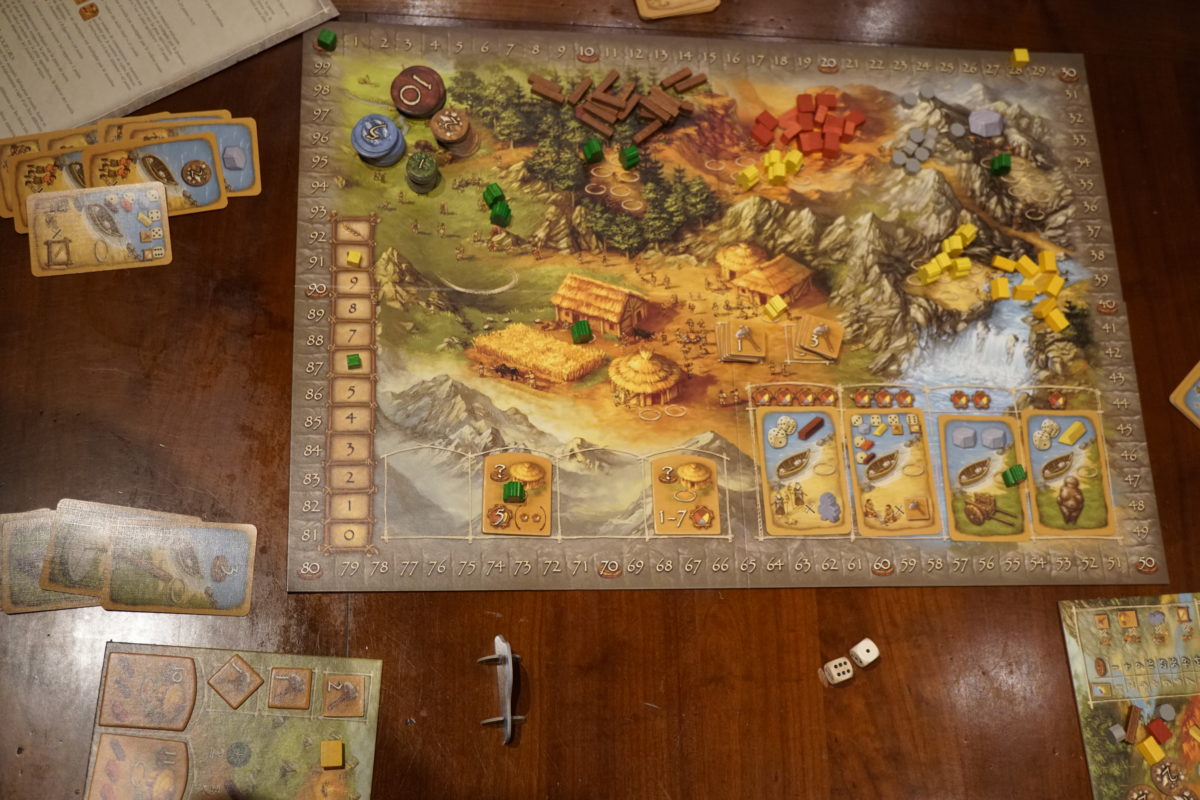 Très belle découverte que cet Age de Pierre. Très classique dans son fonctionnement (placement des membres de votre famille sur cases limitées, possibilité d’augmenter votre famille, nécessité de nourrir votre famille en fin de tour, etc.) mais ça tourne vachement bien ! Vous devez bien entendu acquérir des ressources (nourriture, or, bois, pierre, etc.) pour nourrir votre famille et acquérir des cartes PV mais pour vous procurer ces ressources, vous aller devoir jouer avec des dés ce qui donne une touche de hasard et de fun ! Très cool et à recommander vivement pour famille amatrice de bonne petite soirée jeu.