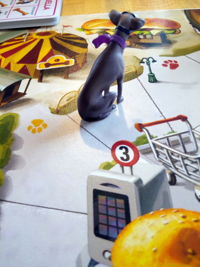 1 – Le chien va en effet devoir se nourrir pour gambader à travers la ville et récupérer les fameux os nécessaires à la victoire. Le curseur du plateau indique le nombre de jours de de stock que possède le chien. Si ce marqueur est à 0 en début de tour, le chien, affamé et sans force, tombe inanimé avant de se faire embarquer par la fourrière… On déplace alors la figurine du chien vers l’échelle de la fourrière ce qui marque la fin de son tour, mais il perd avant tout ce qu’il transportait (os/journaux) qui sont abandonnés sur la case où il se trouvait.