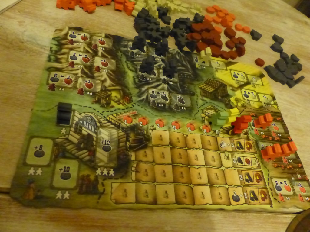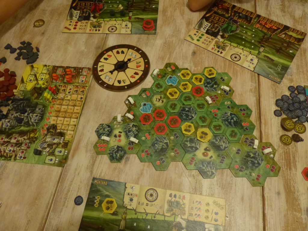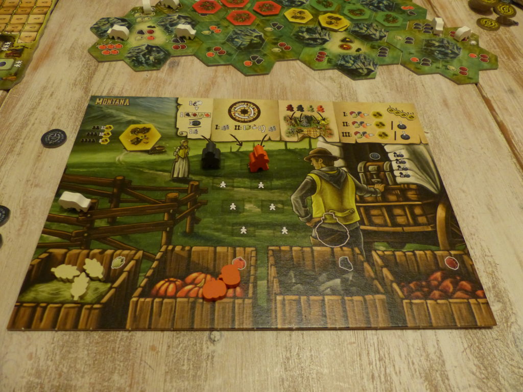 Montana offre un matériel varié avec des ressources en bois et « en forme » (de courges, cuivre, pierre et blé ou encore vaches, ouvriers). Le reste est en carton de bon augure. Le plateau central regroupe les différents emplacements pour les ouvriers (mine, carrière, champs et potagers en plus de la banque et la ville. Le plateau individuel est nettement plus limité. Son role principal sert à garder / comptabiliser ses ressources et ouvriers. Il reprend également une aide de jeu pour les actions disponibles.P1000937