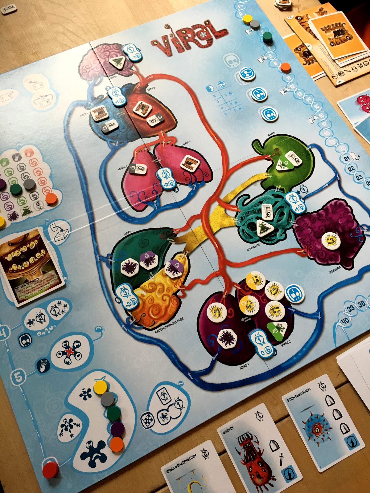 On n’est plus sur d’immenses bateaux qui doivent se faufiler dans l’étroit passage du Panama ici mais dans le corps humain. Sa représentation conceptualisée et colorée sur le plateau de Viral ne peut qu’attirer le regard. Nous y retrouvons les différents organes qui correspondent à des zones dans lesquelles il vous faudra avoir la majorité des virus si vous voulez obtenir des PVs. Ha oui j’oubliais, dans Viral vous représentez un type de virus ! Décidément, avec Medical Frontier, il semble que le thème initié par Pandemie ait fait des petits 😉