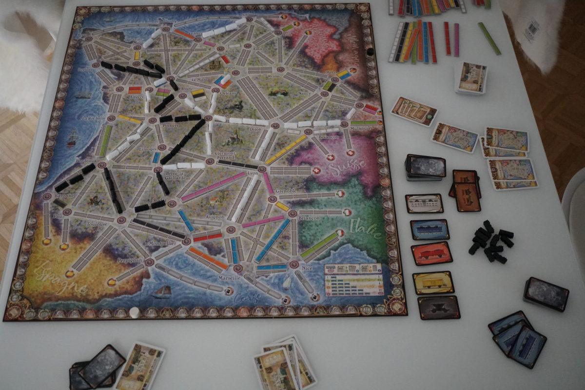 Le plateau de la France est génial. A quelques exceptions près, toutes ses connections sont en chantier. On ne peut pas construire dessus sans y avoir au préalable construit des rails. Les rails sont des barrettes qui vont indiquer la couleur des cartes à jouer si on veut réaliser la connexion. On place ces barrettes lorsqu’on réalise l’action « piocher 2 cartes ». Après avoir pioché les 2 cartes, on doit choisir une des barrettes encore disponibles et la placer sur une connexion en chantier. Dorénavant, on pourra placer nos wagons sur cette connexion à condition de jouer autant de cartes de la couleur de la barrette que sa longueur.