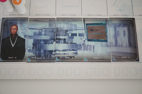 Les joueurs se dirigent alors vers l’entrepont et le voyage leur coûte 3 UT. Pas de chance, le dé déplacement a atterri sur sa face maximum… On dispose les différentes cartes composant l’entrepont et on remarque tout de suite 3 cartes nécessitant une clé spéciale pour être explorées. Les joueurs se placent devant les différentes cartes non scellées du lieu et découvrent ce qu’elles cachent. Là encore, c’était bien vu avec un brin de chance :