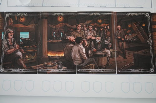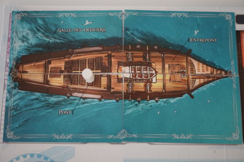 On va déployer les cartes du pont de la caravelle qui nous montre un paysage magnifiquement illustré. Le pont comporte 5 cartes. Nous décidons de répartir nos 4 réceptacles sur 4 des 5 cartes. Il nous faudra une unité de temps supplémentaire pour nous rendre devant la dernière carte et y découvrir ce qui s’y cache. Pour gagner du temps, on aurait pu s’en passer mais on risquait de passer à côté de quelque chose d’important pour la suite du scénario, on a donc préféré ne prendre aucun risque. C’est souvent le cas durant le premier run…