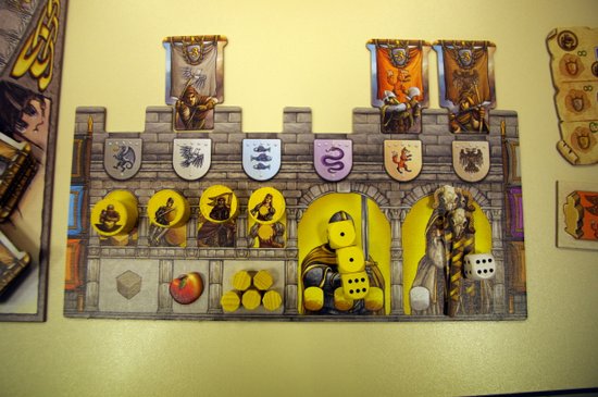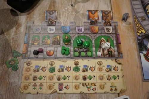 Mais comme dans « Les château de bourgogne » ou « Bora bora » il a été prévu de nombreux garde-fous à ce hasard. Parmi les éléments à récupérer durant la partie un grand nombre va nous servir à marquer des points, mais surtout à déclencher des actions détournant le hasard. Pour une pomme permettant de donner la valeur de son choix à son dé, un drapeau permettra de retourner un dé, un autre de copier l’action d’un autre chevalier, ou encore un troisième de réaliser l’action de la case opposée du disque d’actions. On aura donc à faire face au hasard du lancer mais comme toujours on devra se concentrer sur la meilleure façon de plier ce hasard à nos intérêts. Si l’on ajoute à cette vue d’ensemble que les dés sont jetés tous au début du tour et que suivant l’ordre dans lequel on va les utiliser nos actions seront totalement différentes on se rend bien compte que le hasard est bien contourné.