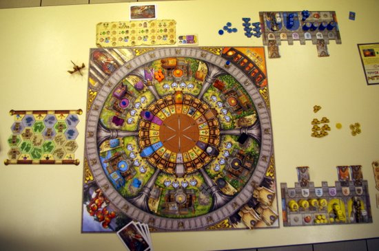 Au-delà des clichés sur la salade feldienne (pour un bar à jeux je ne peux que conseiller de créer un tel menu !) il y a une autre constante immuable chez mon auteur favori : l’absence de thème ou tout du moins le vernis très faible qu’il appose sur ses créations. Comme Rieneck n’est pas forcément l’auteur le plus créatif à ce niveau non plus (malgré toutes les qualités que je trouve à Cuba ou à Fortuna) j’ai sans surprise constaté ici que Merlin ou pas, table ronde et chevaliers aussi beau soient-ils, le thème s’oublie aussi vite qu’on se lance dans des calculs. C’est toujours surprenant pour ceux qui ne connaissent pas Stefan Feld et donc bon à savoir avant de se lancer dans ce jeu, mais c’est bien loin d’être important si tant est que le jeu se révèle bon.