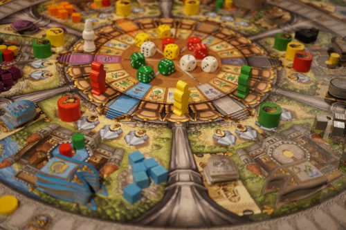 Chaque joueuse va lancer 3 dés à sa couleur et s’en servir pour déplacer son chevalier autour de la table ronde. A chaque case correspond une action. L’astuce de génie c’est le choix de l’ordre des dés. Si on obtient 2, 3 et 5 par exemple. On peut d’abord utiliser le 5 pour réaliser l’action de la 5ème case puis le 2 pour réaliser celle de 2 cases après ou d’abord utiliser le dé 3 puis le dé 5,… Avec les 3 dés, il peut donc y avoir pas mal de possibilités différentes et ça c’est extrêmement bien fait. Mais on aura ce choix que pour les 2 premières actions. La 3ème sera toujours la même puisqu’elle correspond à la somme des 3 dés.