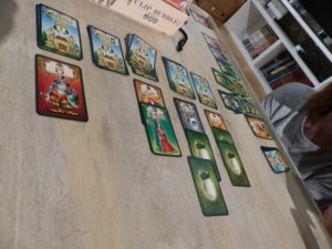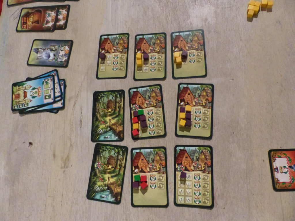 Enfin, les villages. Ici, c’est un peu particulier. Il s’agît d’un majorité mais les PVs varient en fonction des lignes qui sont débloquées. Par exemple, sur le photo ci-dessous, la carte du milieu en haut, les 2 premières lignes sont débloquées. Le jaune, majoritaire, gagnera 4 PVs, le mauve, deuxième seulement 2PVs. Si la 2ème ligne avait été complétée et la troisième entamée (donc débloquée aussi), le joueur majoritaire aurait gagné 8 PVs, le second 4 PVs et le troisième 2PVs.