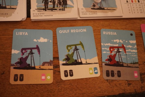 Rien de bien palpitant dans les actions proposées et c’est ce qui gâche un peu le plaisir de Peak Oil.  Il y a peu de tension et les choix sont assez évidents pour tout mathématicien qui se respecte.  La manière de gagner des PVs résulte en effet d’une simple multiplication.  Pour chaque région, on va multiplier le nombre d’infrastructures qu’on possède par le nombre de barils sur la région ainsi que sur nos cartes puits.  Pas folichon folichon 😉  Les illustrations sont très design et plaisent, bien qu’elles manquent cruellement de variété.  Les puits, par exemple, ne diffèrent que par le paysage de fond et leur couleur (voir photo à droite).  Heureusement, un système de prise de risque aléatoire ainsi que la mécanique originale de placement d’ouvriers majoritaires viennent sauver le tout et apporte une petite tension et un petit piment tout spécial qui permet d’apprécier finalement ce petit jeu assez simple.