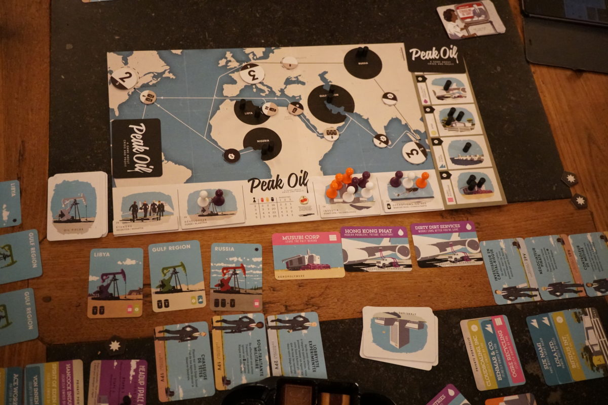 Peak Oil est néanmoins beaucoup plus simple que son ainé.  Il s’explique et se joue plus rapidement (comptez 1h20 de jeu) et peut même se jouer dès 10 ans (8 ans sur la boite…).