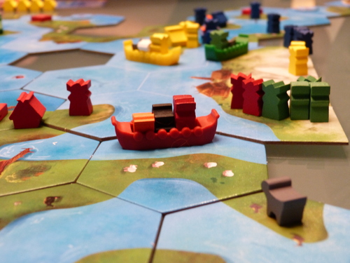 2 vikings situés à côté de l’intersection de 3 tuiles terre peuvent construire un avant-poste qui rapportera des PVs également et contribuera, selon un système de majorité, à contrôler les îles.