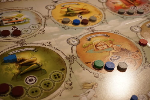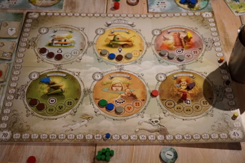 Le jeu étant calculatoire (pour remplir ses objectifs, il faut des jetons de couleurs bien précis qu’il faut récolter sur le plateau central) et tactique, il faut régulièrement attendre son tour, attendre que ses adversaires analysent leur situation et optimalisent leurs 5 points d’action. Malgré cela, le jeu tourne bien et est bien huilé et ne s’éternise pas.