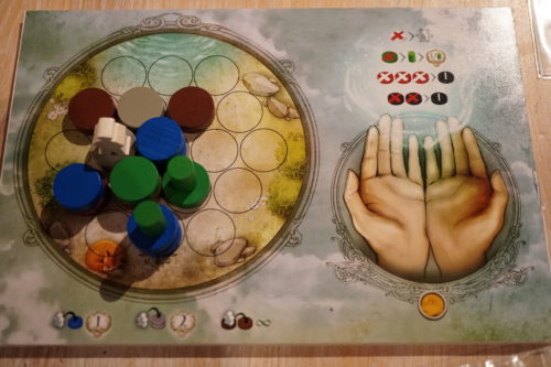 Gris : on peut uniquement le placer sur son plateau. Il représente des roches. Deux roches (ou plus) l’une sur l’autre forment une montagne. Et chaque fois qu’on passe sur une montagne en déplaçant son rêveur on scorera immédiatement 2 points, car la vue est belle depuis le sommet de la montagne! Encore une fois en plein dans le thème!
