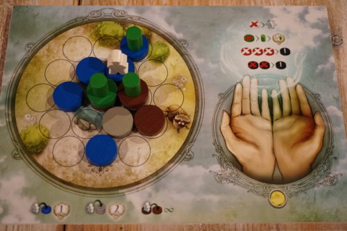 Vert : si placé sur son plateau ce sera de l’herbe, sur laquelle on pourra se déplacer. Si dépensé il permettra de placer un arbre, qui donnera des points directement (autant de points que d’arbres dans son jeu, soit 1 pour le 1er, 2 pour le 2ème…) et améliorera la zone sur laquelle il est placé (il double la valeur du fragment sur lequel il se trouve, pour déterminer le gain des objectifs de fin de partie – cfr plus bas).