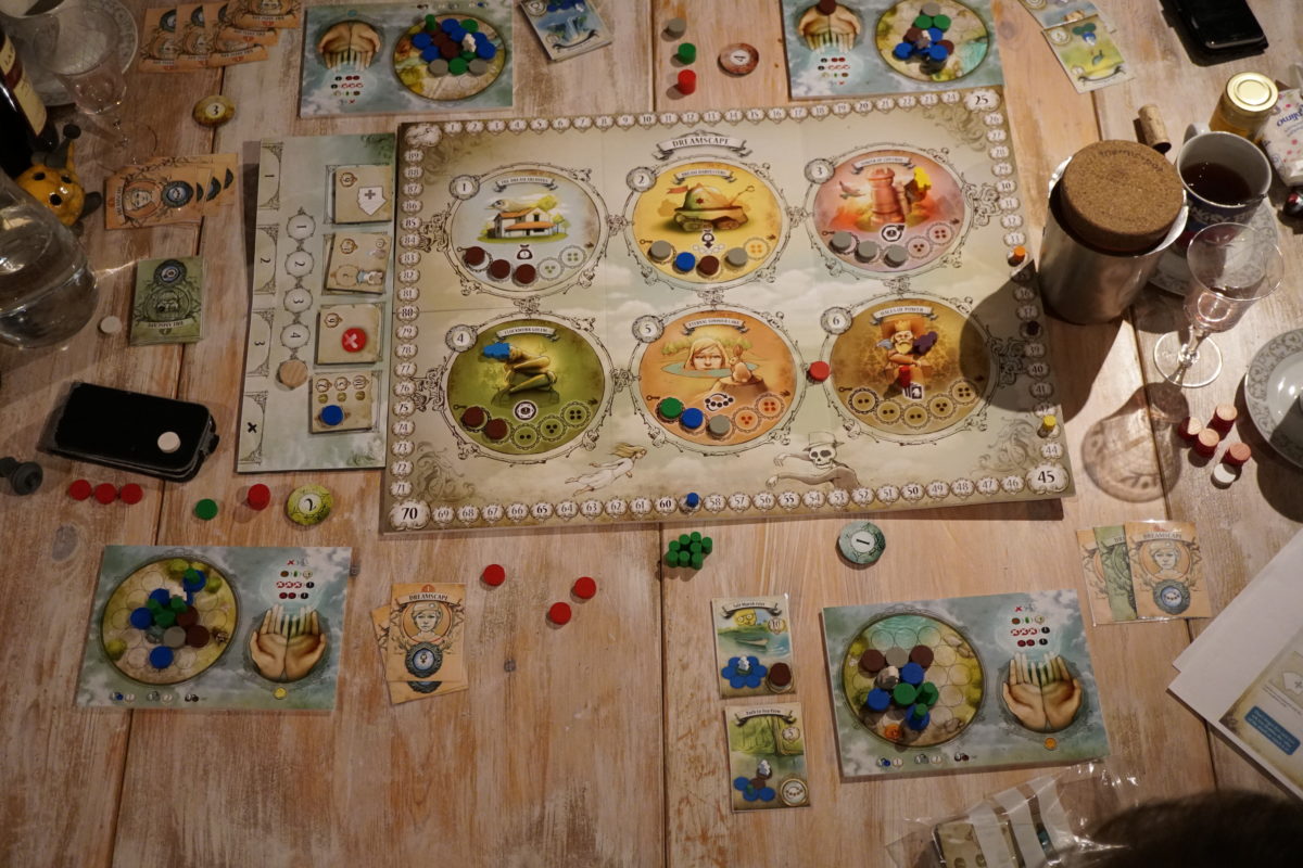 Dans ce prototype, les rêves sont composés de plusieurs jetons de couleurs diverses. Chaque couleur a une spécificité (exemple, le marron permet un déplacement gratuit sur son plateau individuel). Les jetons rouges sont les cauchemars, à éviter si possible. Quant au déroulement du jeu, on retrouve des points d’actions à dépenser pour se déplacer, récolter un ou plusieurs jetons sur le lieu où l’on est. Les lieux proposent également un bonus comme par exemple ré-agencer l’ordre des jeton du lieu.