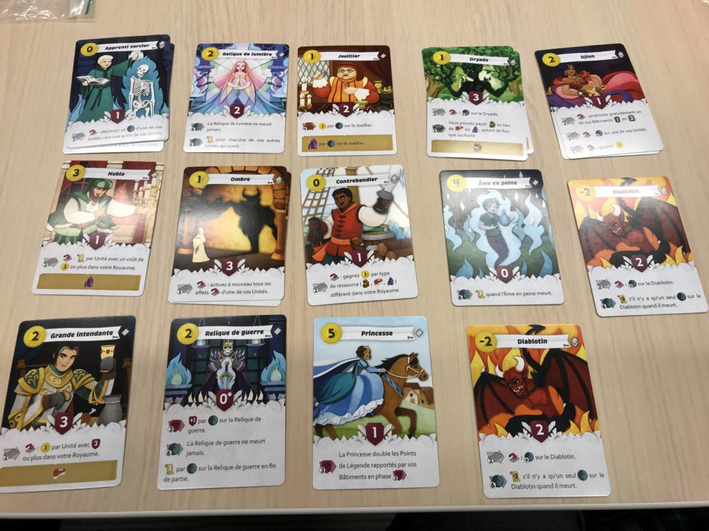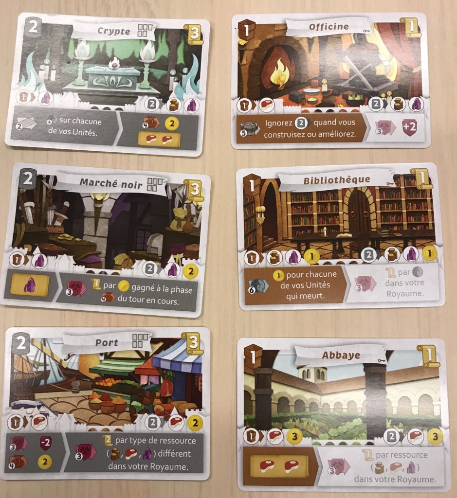C’est là bien entendu la nouveauté essentielle d’Au-delà des portes. A chaque partie, en plus de 4 des 5 bâtiments de base, on va tirer 3 bâtiments de l’extension au hasard qui viendront compléter ceux de base pour faire 7. Cela va étendre les possibilités stratégiques et la variabilité des parties. Même si on peut regretter la nécessité de garder les 4 bâtiments de base qui fait perdre une partie de la variété potentielle, on peut la comprendre vu la volonté de garder un certain équilibre au jeu.