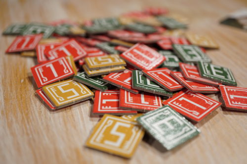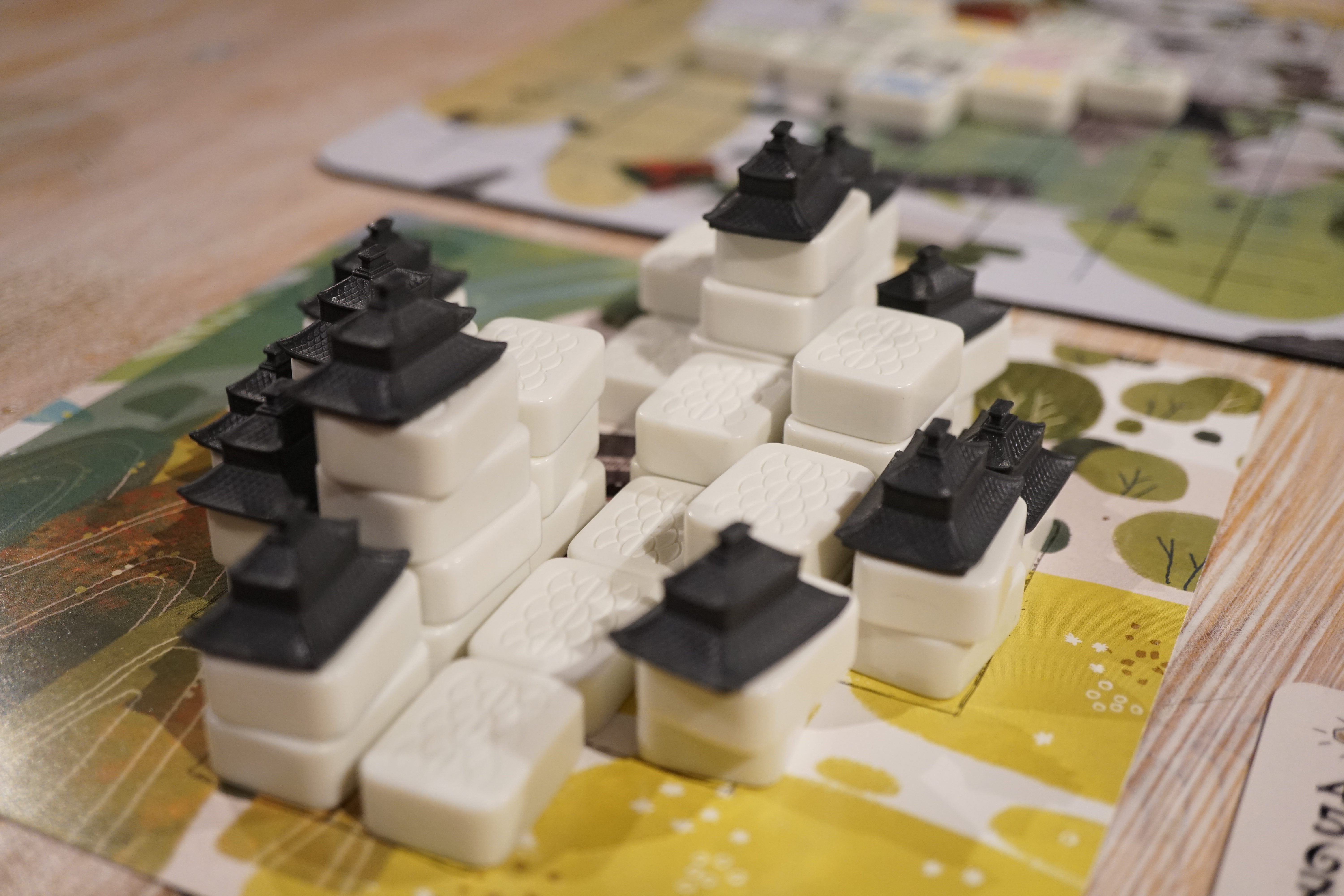 Le dernier élément: on peut placer un (ou deux) toit(s) sur les tuiles qu’on vient juste de retourner. Les toits rapportent des PV en fin de partie: 1 si posé au premier niveau, 2 si posé au deuxième niveau et 3 PVs si posé au troisième niveau. Un toit posé plus haut ne rapporte pas plus de point que le niveau 3.