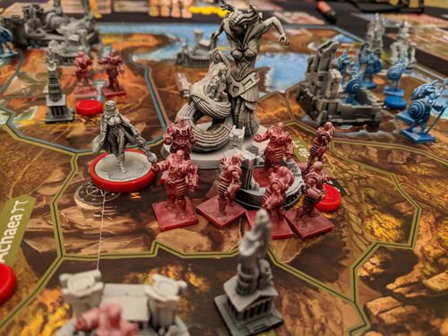 Pour activer les monstre, on lance un dé pour chaque monstre et ce dé va indiquer si le monstre décide d’attaquer la région où il se trouve (en tuant des hopilites) ou s’il se déplace dans une région voisine au choix du joueur.