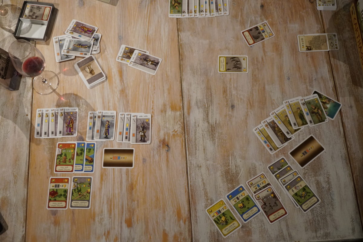 Alexander retourne à ses premiers amours en publiant un jeu de cartes au format de l’excellent Port Royal. Un peu comme dans le non moins très chouette La Gloire de Rome, vous allez pouvoir placer vos cartes au-dessus, à droite ou à gauche de votre carte centrale donnant, à chaque cartes, des effets différents.