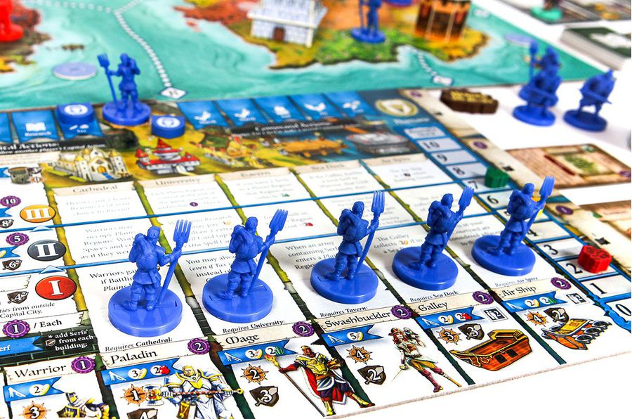 Excellent jeu extrêmement varié. Très grande originalité dans les actions , le fait de suivre une action capitale avec un serf ou encore utiliser un serf pour accomplir un enchaînement de deux actions de commande. Combat pas du tout compliqué à condition d organiser l enchaînement des diverses options. Il y a la boite de base avec les nains humains elfes et orques mais aussi l extension ordre et chaos qui propose 4 nouvelles factions qui augmentent la rejouabilité. Une autre extension pestilence propose 2 nouvelles factions l une aerienne avec le matériel «dans les airs» adéquat et une autre sous marine. A cela s ajoutent plusieurs petites extensions sympathiques telles que des machines de guerre des mercenaires hauts en couleurs des nomades,...un excellent achat q