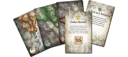 Et voilà, c’est pas plus compliqué que ça ! Vous savez tout sur Bataille pour Rokugan. Bon, vous pouvez ajouter à ça quelques détails tels que des pions permettant de protéger quoiqu’il en soit une province ou d’autres permettant de la détruire. Un peu comme dans le très bon Inis, à chaque territoire correspond une carte pouvoir que le joueur contrôlant le territoire reçoit. Ca lui donne de chouettes bonus qui encourageront les autres joueurs à lui mettre des bâtons dans les roues. Surtout que la stratégie sera également dictée par des objectifs secrets…