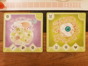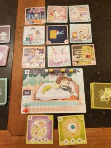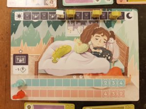 Chaque joueuse a son plateau personnel, sur lequel elle posera son personnage reçu au départ (qui a un pouvoir unique qui permettra d’aider selon les circonstances) et les cartes pouvoir qui serviront pour créer des beaux rêves, capturer des cauchemars ou attraper des monstres.
