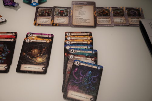 Là aussi c’est original puisque les cartes acquises vont dans votre main et peuvent être jouées directement. Ca peut mener à des enchainements intéressants… On a en quelques sortes l’assurance qu’on pourra jouer les cartes acquises au moins une fois 🙂 Ca permet aussi de se constituer une main car certaines cartes s’acquièrent gratuitement tandis que d’autres nécessitent de jouer une carte.