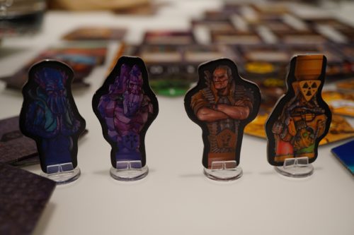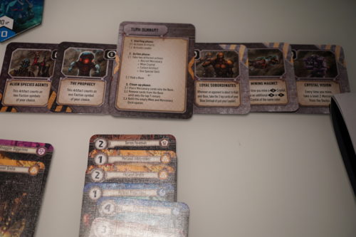 Les artefacts ont des coûts entre 4 et 7 et s’acquièrent en jouant un groupe de cartes mercenaires dont la somme des niveaux équivaux au coût. Les artifacts restent devant vous et vont vous donner des habilités intéressantes comme pouvoir se protéger des raids ou gagner des PVs d’une manière alternative.