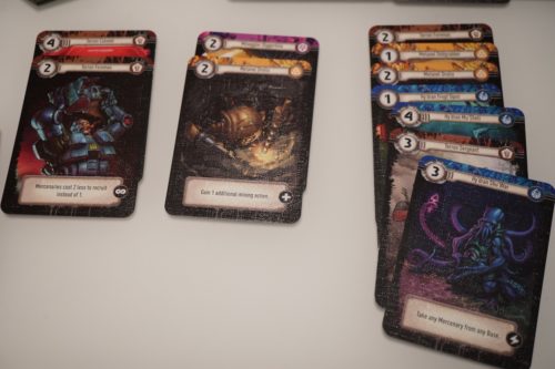 On commence la partie avec 3 cartes mercenaire piochées au hasard dans 2 paquet différents (le hasard de cette pioche n’est absolument pas dérangeant). Chacun joue à son tour et, à son tour, on a le choix entre exécuter 2 des 4 actions possibles ou de réaliser un raid.