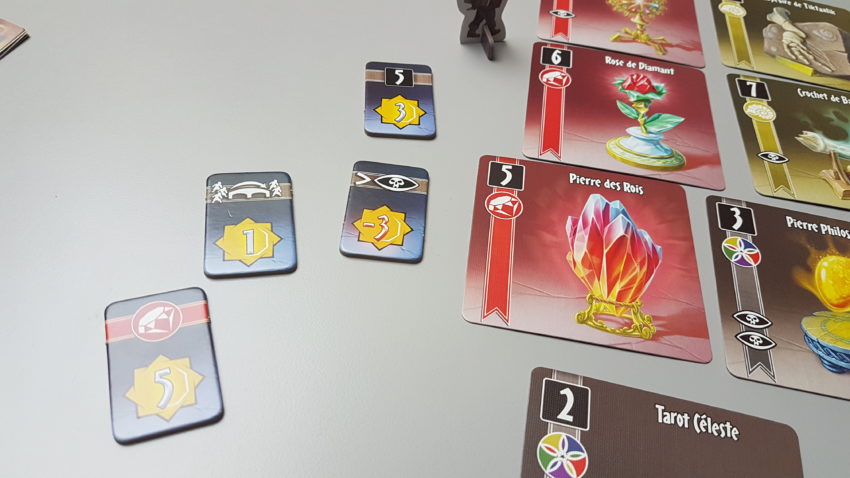 Quand tout le monde est sorti, il ne nous reste plus qu’à procéder aux décomptes, valeurs par symbole, type de valeur, bonus/malus de sortie et de malédictions. Celui qui a le plus de points remporte alors la partie.
