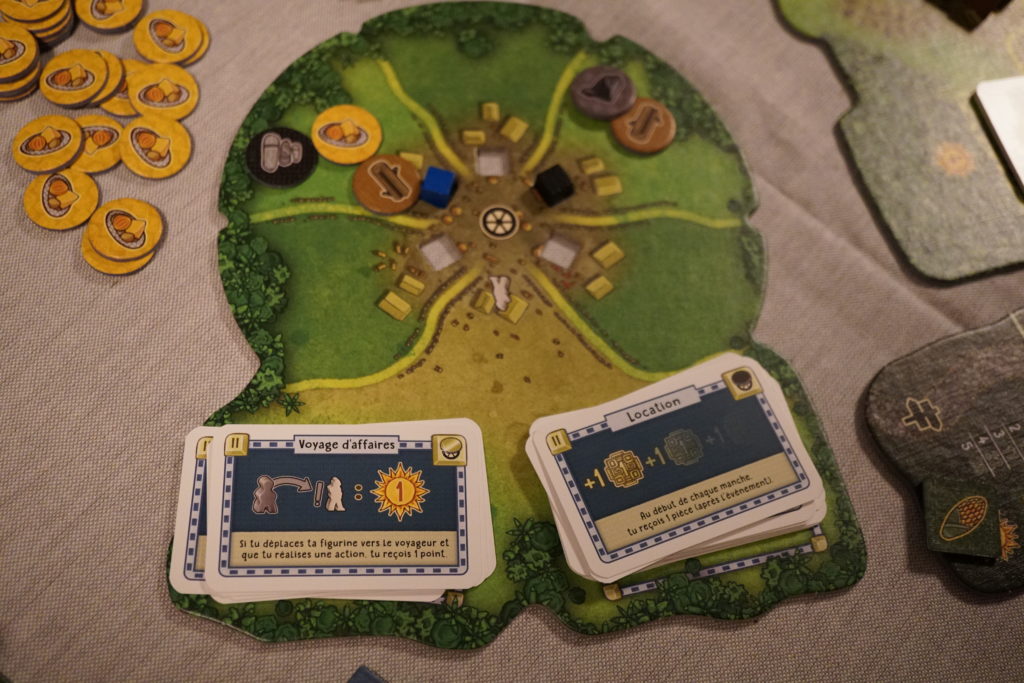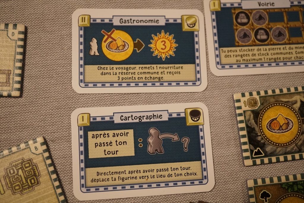 Nous ne les avons pas trouvées toutes super intéressantes et un peu déséquilibrées ce qui avantage le premier à aller se servir. Et vu l’attrait résistible 😉 du voyageur, il ne va jamais influencer votre choix. Vous allez toujours choisir vos actions suivant votre tirage de pion comme dans le jeu de base et vous allez profiter de la présence du voyageur sur une de celles-ci ou pas… Je n’ai donc pas trouvé cette extension indispensable surtout qu’elle alourdit le jeu lorsqu’on doit choisir une des nombreuses cartes pouvoir à acquérir. Heureusement, ces pouvoirs sont assez sympas à jouer et apportent un petit plus au jeu. C’est normal, qui n’a jamais rêvé de voyager?
