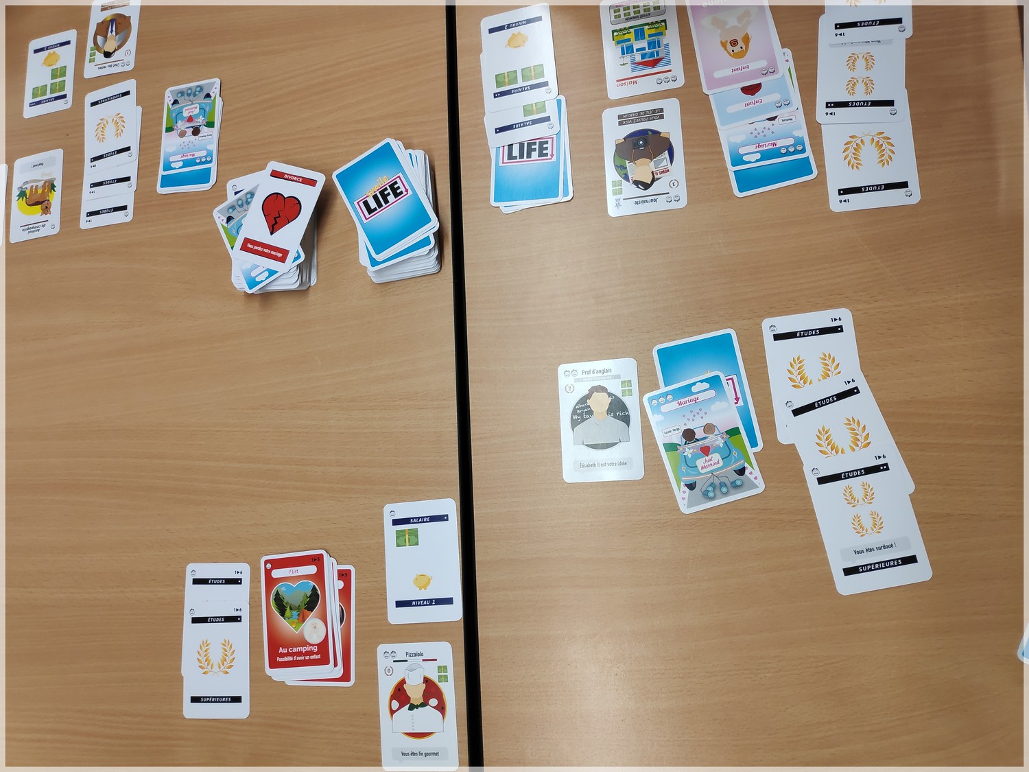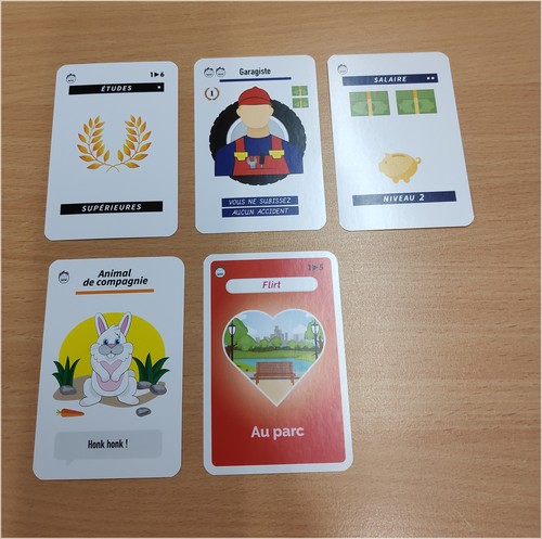 Chaque carte jouée symbolise l’évolution de votre vie sociale culturelle et financière. Comme dans dans toute bonne carrière, vous commencez par poser des cartes « Etudes » qui vous mèneront par la suite à pouvoir poser une cartes « métiers », ces métiers apportant pour la plupart des capacités spéciales et surtout vous permettant enfin de percevoir un salaire. Bien entendu ces cartes ont toutes un niveau plus ou moins important, de longues études amenant des métiers plus valorisants et un salaire bien plus conséquent.