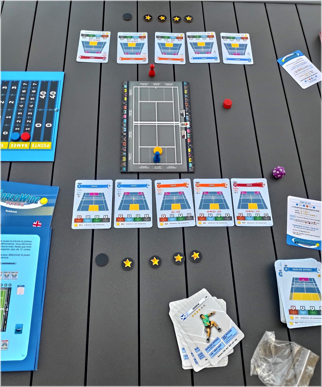 Chaque joueur va devoir gérer un ensemble de 65 cartes qui vont simuler les différents échanges classiques du tennis, du service en passant par des coups droits d’attaque, des revers fracassants voire des volées au toucher parfait ! 6 cartes de base + 6 cartes piochées au hasard dans chaque deck personnel formera la main de départ du tennisman.
