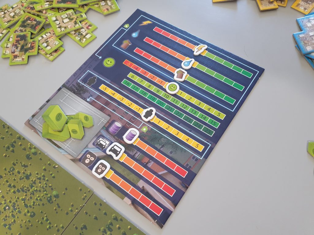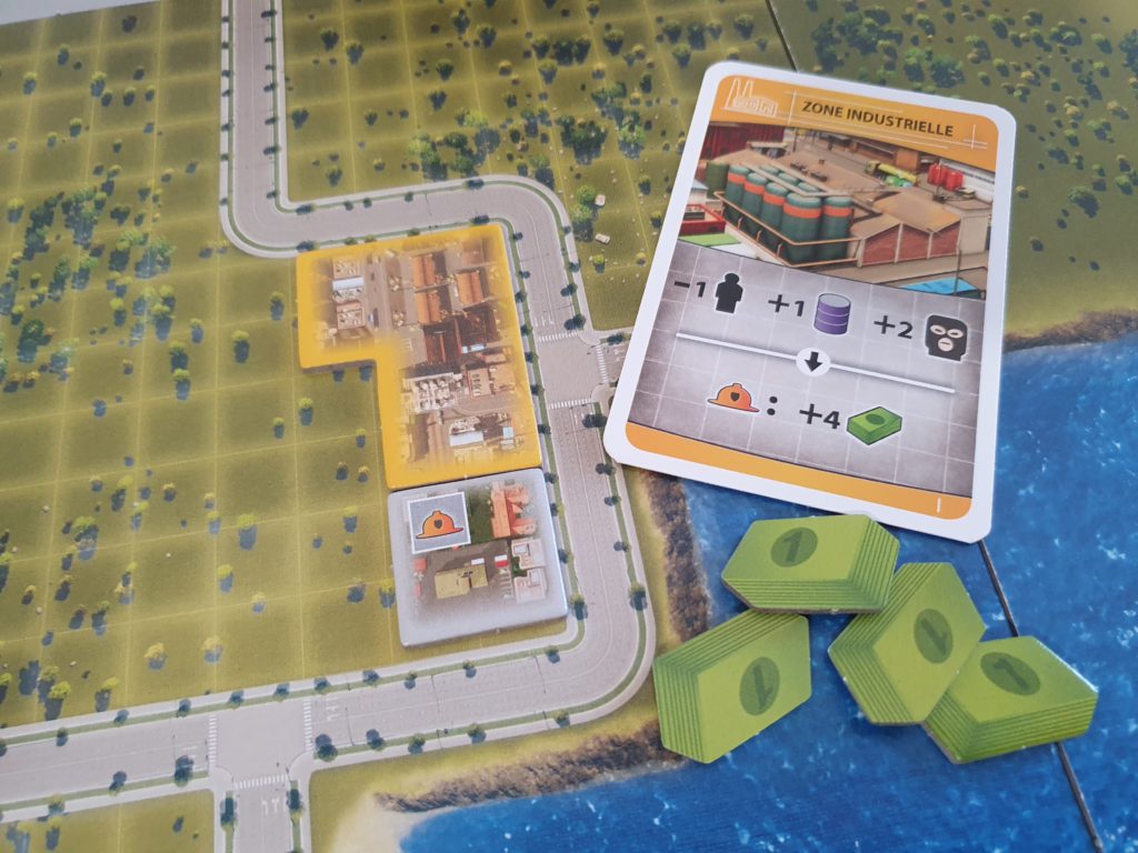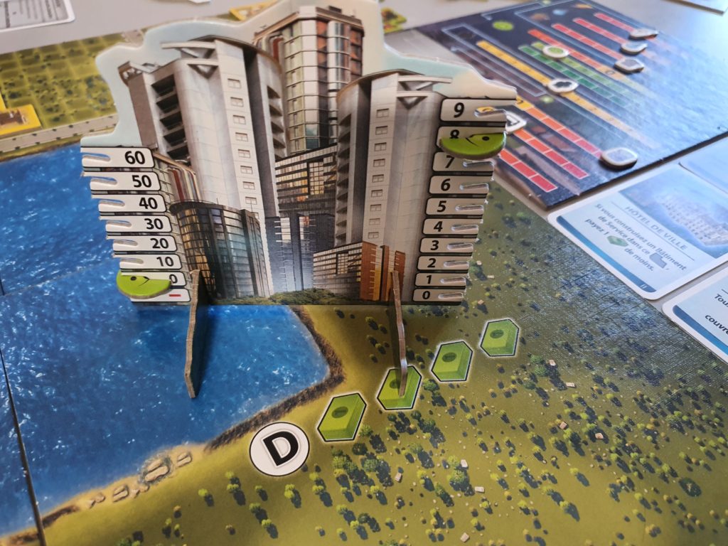 Le vice du jeu est également amplifié par le fait qu’un seul service de chaque sorte ne pourra être construit par quartier (un seul bâtiment médical, une seule caserne de pompier, etc…) C’est à ce moment là que vous aurez envie de passer l’étape pour retourner d’autres tuiles de terrain. Mais si cela permet de créer de nouveaux quartiers disponibles et d’engranger du bonheur sur le gros marqueur de ville, le retournement des tuiles aura un coût qui viendra impacter vos finances si difficile à faire fructifier !