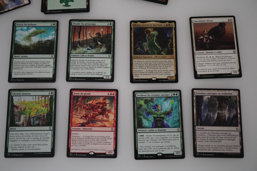 La renaissance de Zendikar propose également 2 nouveaux decks commander dont la colère de Zendikar que j’ai eu la chance de jouer. Le deck tourne autour de la créature légendaire Obuun qui exploite une des mécaniques de Zendikar: la pose de terrain. En effet, aussi simple que ça puisse paraître, une des mécaniques centrales de Zendikar est la pose de terrain. De nombreuses cartes vont activer leurs effets lorsqu’un nouveau terrain vient en jeu sous votre contrôle. Obuun fait de même. Il place un jeton +1/+1 sur une créature (en général lui-même) à chaque fois qu’un terrain arrive en jeu. Et à chaque tour, il peut transformer, jusqu’à la fin du tour, un terrain en une créature avec piétinement dont la force et l’endurance équivalent à la force d’Obuun. Et en soutien au commander, d’autres cartes vont permettre de placer plus d’un terrain par tour ou d’augmenter les marqueurs +1/+1. La colère de Zendikar est un deck cohérent et très puissant qui concurrencera certainement vos meilleurs decks commander.