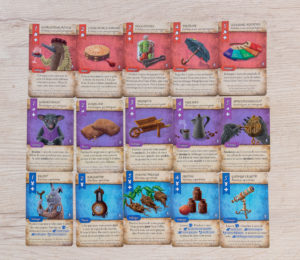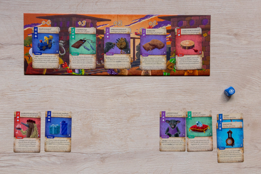 L’objectif est de créer en premier 8 étals de valeur progressive. Pour cela il faut utiliser de manière astucieuse, les 5 cartes de sa main en les jouant soit pour leur valeur, soit pour leur capacité. Le but est d’acquérir des cartes plus puissantes en allant les acheter sur le marché central ou en les volant aux adversaires. Dans La vallée des marchands, l’interaction entre les joueurs est assez présente de manière générale et elle peut même être renforcée en fonction des peuples choisis. Les peuplades ont vraiment des spécificités qu’il faut savoir utiliser : certaines sont des voleuses, d’autres maîtrisent la manipulation de la défausse … Le secret de la victoire est en partie là. À cela s’ajoute une notion de course car il faut être le premier à construire ses étals. Quand on voit ceux des autres avancer et que les siens sont au point mort, un sentiment d’urgence apparaît.
