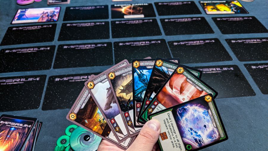 Les joueurs ont une main de cartes. Les cartes servent à de multiples actions comme déplacer son vaisseau dans la galaxie qui est une des actions les plus importantes du jeu. Les cartes vont servir de multiples façons en donnant des avantages pour vos actions futures ou des capacités pour le reste du tour ou même tout au long de la partie. Vous allez également pouvoir jouer des stations qui vous serviront à vous protéger.
