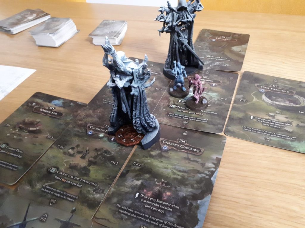 La grande force de Tainted Grail est son histoire, et quelle histoire! Vous allez vite être scotché à elle et voudrez découvrir la suite. Certaines de vos actions vont avoir des conséquences permanentes qui se traduiront par le remplacement de certaines cartes. Et tout ça dans une mécanique de legacy non destructif vous permettant de rejouer au jeu entier autant de fois que vous le souhaiterez. Et l’histoire est tellement riche qu’elle laisse la place à plusieurs explorations tant les embranchements sont nombreux et nombreux sont ceux laissés non explorés… Et même si les combats, certaines rencontres diplomatiques et la recherche des ressources nécessaires à l’activation des Menhirs pourront sembler fastidieuses, l’ensemble du jeu est scotchant et relève d’une grande maitrise de la narration, de l’imagination, de la surprise et du suspense.