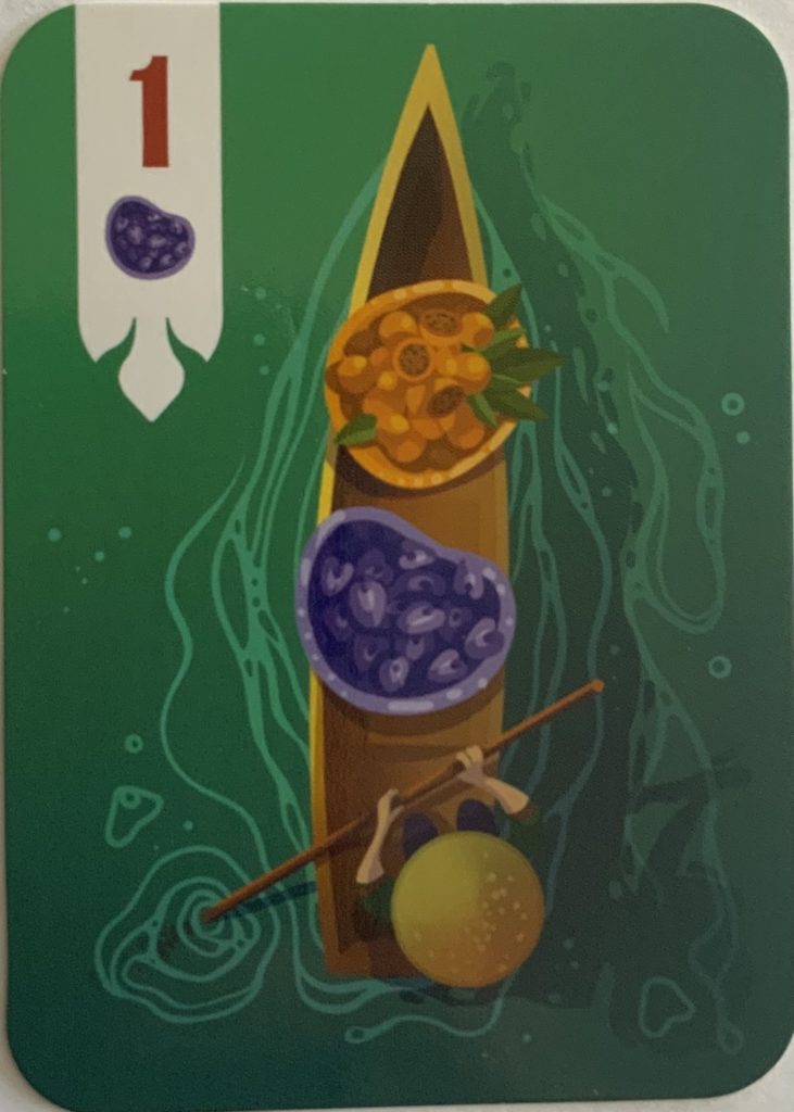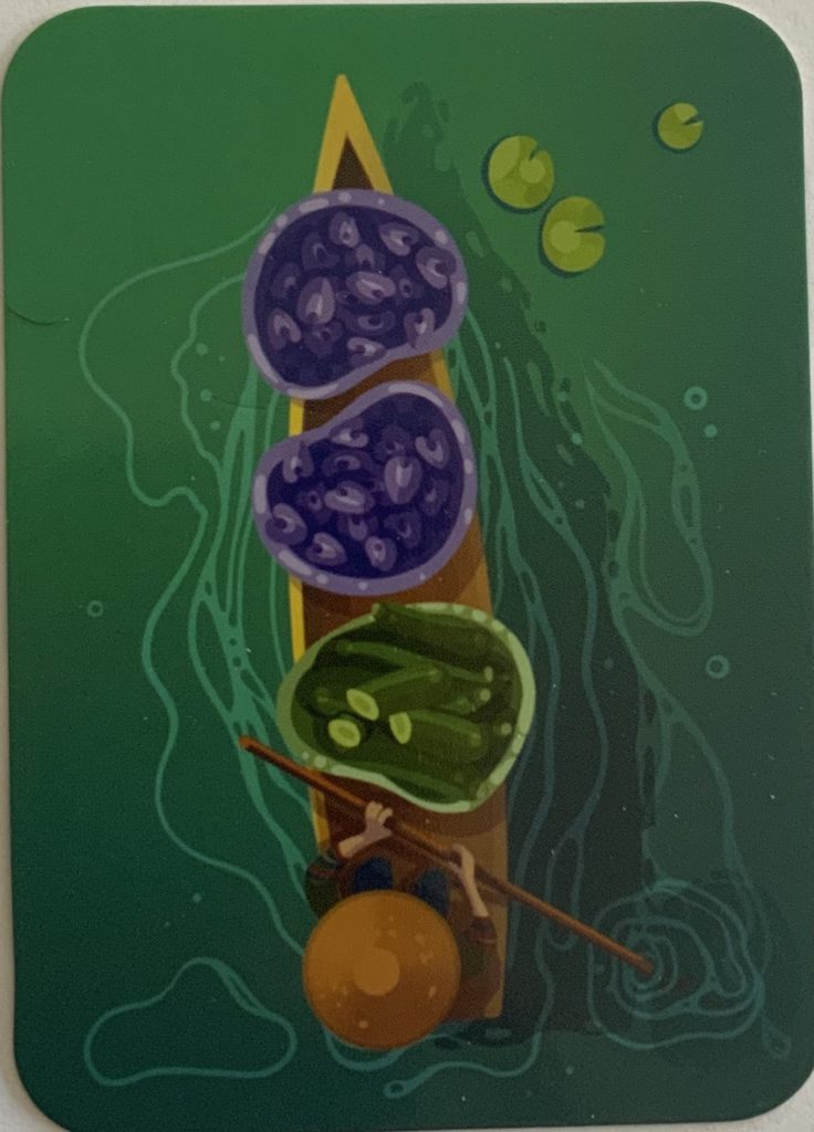 Vous allez construire votre tableau 3×3 avec des barques remplies de victuailles. Mais le système de prise de cartes (sur le marché au centre) va rendre ça beaucoup plus retors qu’il n’y parait au premier abord. Vous voulez beaucoup de cartes? Ok mais alors il faut sacrifier une carte avec beaucoup de nourriture, qui aurait pu vous rapporter beaucoup de points. Et vice-versa. Tout en ajoutant que vous pouvez prendre des cartes en partant de n’importe quel côté du marché (mon texte n’est pas clair mais en jouant vous comprendriez immédiatement), ce qui aura un impact sur les choix de la joueuse suivante.