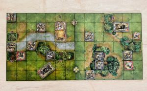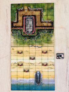 Comme dans la majorité des jeux à scénarii, on vous indique les tuiles à positionner pour représenter le champ de bataille, les effectifs disponibles ainsi que les objectifs à atteindre. Mais nous avons trouvé des aspects originaux dans ce titre qui lui confère un petit plus par rapport aux autres du même type que j’ai pu tester :
