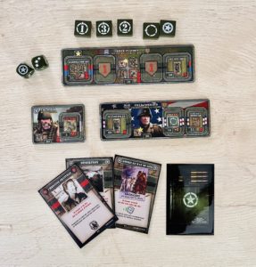 La phase d’ordre. Cette phase est la première et je l’ai trouvé extrêmement intéressante. On se voit attribuer un nombre de pion Ordre en fonction du nombre total d’étoiles présent sur nos tuiles Armée. Ces pions, numérotés, sont placés face cachée sur les troupes que l’on veut activer ce tour ci. Le chiffre inscrit dessus détermine la position dans laquelle la troupe sera jouée. L’adversaire a donc une idée des équipes que vous allez déployer mais pas de l’ordre dans lequel vous allez les jouer. De plus, pour brouiller les pistes, chacun possède un pion neutre servant de leurre. Une petite part de bluff bien sympathique dans un wargame. Après cette phase, les deux protagonistes activent leurs troupes à tour de rôle. Elles peuvent se déplacer et attaquer en fonction des capacités inscrites sur leur tuile mais aussi en fonction des cartes que l’on peut jouer. Dans Heroes of Normandie, chaque joueur dispose d’un deck de cartes dans lequel il pioche un nombre défini par le scénario. Cet aspect aléatoire, comme celui des jets de dés lors des combats, ajoute une part de hasard représentant bien les aléas de la guerre.