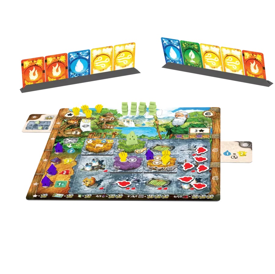 Dans un monde post-apocalyptique, les tribus du vent vont reconstruire le monde sur les ruines polluées du passé. Les joueurs devront planter des forêts, construire de nouveaux villages et temples et décontaminer les zones environnantes. Ils pourront jouer les cartes de leur main. Mais faites attention! L’effet ou même la possibilité de jouer la carte peut varier selon… le dos des cartes de vos adversaires. Les joueurs peuvent également envoyer leurs voltigeurs explorer la région, planter des forêts ou construire des villages et des temples en utilisant toutes les ressources rassemblées. Tout au long du jeu, vous réussirez à remplir certains objectifs qui vous permettront de débloquer les capacités spéciales de votre guide et d’améliorer les pouvoirs de vos tribus. Lorsque quelqu’un construit son 5e village, le jeu est sur le point de se terminer. Le joueur avec le plus de points, en fonction de la pollution, des villages, des temples, de l’aménagement de leurs forêts et d’autres objectifs divers, sera le vainqueur !