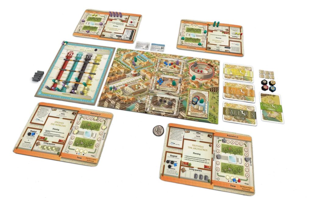 Galenus est un jeu de placement d’ouvriers dans lequel vous prévoyez d’effectuer jusqu’à 6 actions, puis décidez quand et comment les résoudre. Ainsi, certains joueurs peuvent encore planifier leurs actions pendant que vous les résolvez déjà. Vous pouvez choisir de recruter et de traiter des patients – acquérir des connaissances dans l’un des quatre domaines – publier des ouvrages basés sur ces connaissances, acquérir des herbes pour vous aider dans votre travail, vous ressourcer dans les bains ou adopter une nouvelle philosophie. À la fin de l’année, vous participez à des concours médicaux en dépensant votre concentration et vos connaissances pour gagner en réputation. Si vous publiez suffisamment d’œuvres remarquables ou si vous avez le plus grand impact sur Galenus, vous gagnerez son respect et entrerez dans son sanctuaire intérieur.