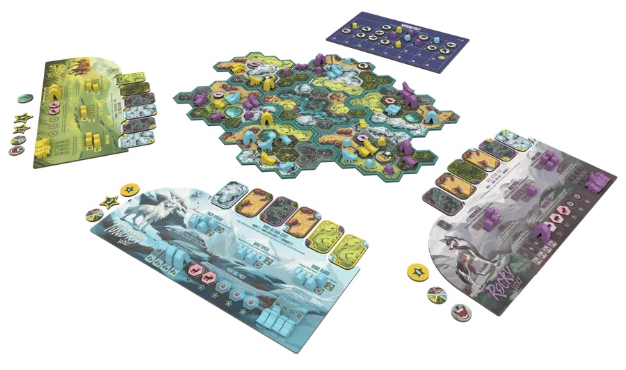 Un mécanisme intelligent de sélection d’action guide vos choix. Chaque action nécessite que vous retourniez des tuiles de terrain correspondant au terrain sur lequel vous souhaitez effectuer votre action. Ces tuiles double face signifient que les actions que vous entreprenez ce tour détermineront les types de terrain sur lesquels vous pourrez agir au tour suivant. Au fur et à mesure que vous prenez des mesures pour étendre le contrôle de votre meute sur chaque région, vous améliorerez également les attributs de votre meute, vous permettant de prendre des mesures plus agressives au fur et à mesure que le jeu avance. Il y a 3 phases de score en milieu de partie où la puissance est calculée dans chaque région. À la fin du jeu, les joueurs totaliseront des points en fonction des jetons VP gagnés lors de ces phases de notation et du nombre de VP le plus élevé révélé dans chacune des 6 pistes de votre plateau de joueur. Le joueur avec le plus de PV gagne !